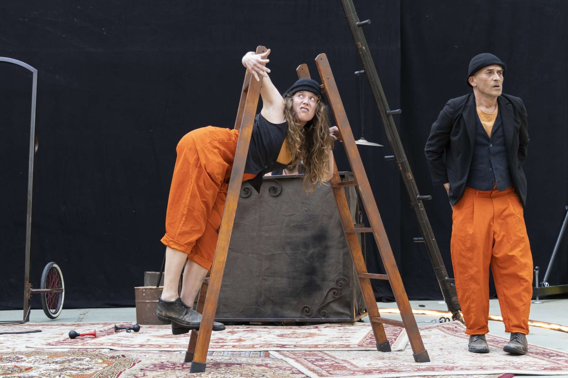 Fly me to the moon est le voyage possible de deux clowns vers la lune, la prouesse de deux rêveurs innocents. Devant un monde qui va trop vite, le spectacle se veut être un cadeau pour les sens : riez, écoutez, laissez-vous surprendre et jouez avec ce duo solaire.